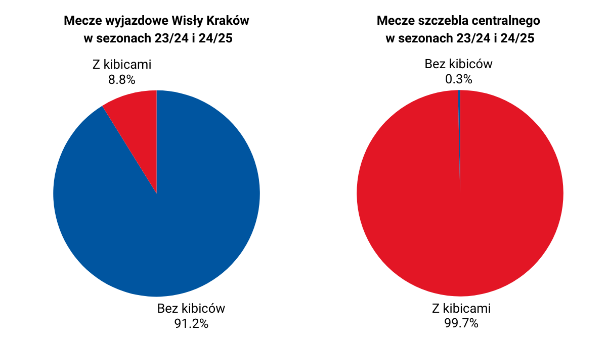 - Sezon 2023/2024: 17 meczów wyjazdowych bez fanów Wisły. Szacowana strata: 6,12 punktu. Zamiast 50 punktów i 10. miejsca, klub mógłby mieć 56 punktów i zająć 4. miejsce, dające grę w barażach o Ekstraklasę i możliwość rozegrania meczu półfinałowego w roli gospodarza.