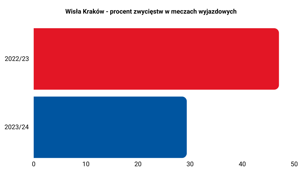 - Sezon 2024/2025: 14 meczów wyjazdowych bez kibiców. Szacowana strata: 5,04 punktu. Zamiast 62 punktów i 4. miejsca, Wisła mogłaby mieć 67 punktów, co dałoby jej 3. miejsce i komfortowe miejsce w barażach o Ekstraklasę.