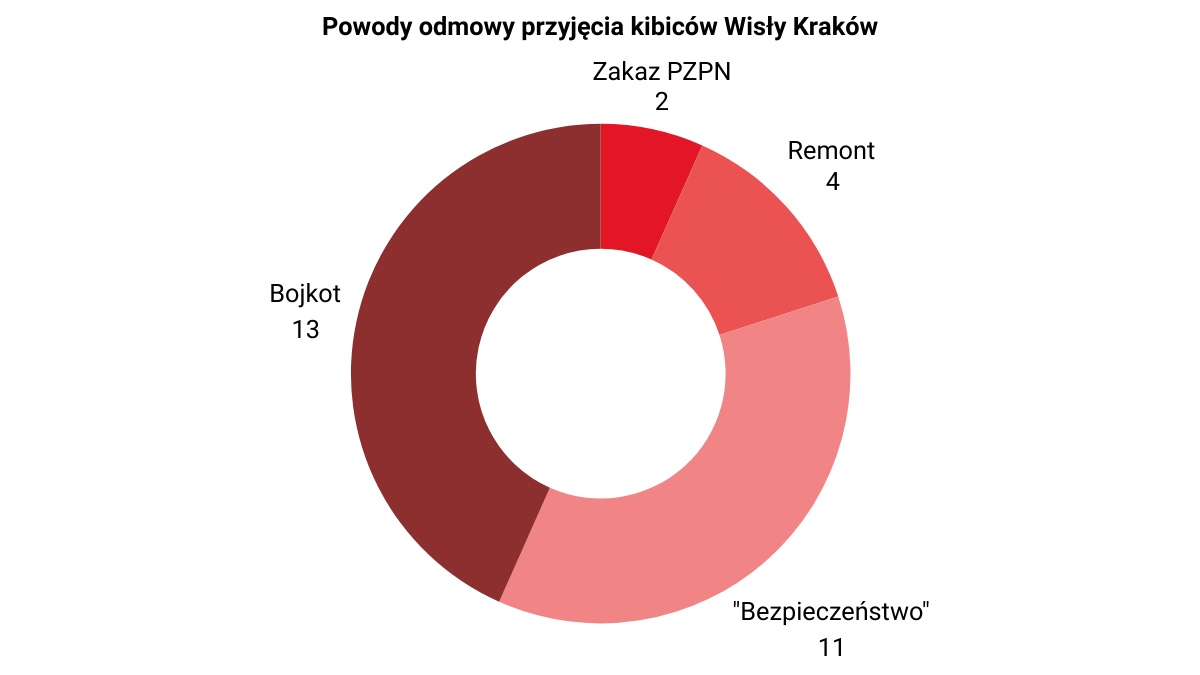 Wiele z tych uzasadnień budziło poważne wątpliwości, zwłaszcza gdy porównamy je z przepisami PZPN. Te stanowią, że klub-gospodarz ma obowiązek przyjąć kibiców gości (min. 5% pojemności stadionu ), a odmowa może nastąpić jedynie na podstawie decyzji organów państwowych lub PZPN oraz w szczególnie uzasadnionych przypadkach, gdy istnieją realne, udokumentowane przesłanki wskazujące na możliwość zaistnienia zagrożeń dla bezpieczeństwa uczestników lub przebiegu meczu. Spośród 31 przypadków decyzji odmawiających przyjęcia kibiców Wisły, żaden z klubów takowej dokumentacji nie przedstawił. Co więcej, nawet status meczu "podwyższonego ryzyka" nie jest automatyczną podstawą do zamknięcia sektora gości. Statystyki są tu miażdżące: poza meczami Wisły, takie zamknięcia zdarzały się niezwykle rzadko – niespełna co 300-tny mecz! Warto przy tym podkreślić, że w sezonach 2022/2023 i 2023/2024 łącznie aż 326 spotkań na szczeblu centralnym (Ekstraklasa, I Liga, II Liga) zostało przez policję zakwalifikowanych jako mecze o podwyższonym ryzyku. Mimo to, niemal wszystkie z nich odbyły się z udziałem kibiców gości. Pokazuje to, że odpowiednia organizacja i środki bezpieczeństwa zapewniane przez policję są wystarczające, a argument "podwyższonego ryzyka" w przypadku Wisły jest zwykłym pretekstem do odmowy przyjęcia Wiślaków.