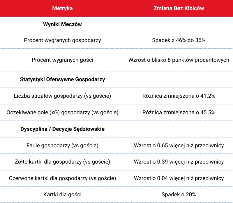 Podkreślam – to szacunek wyjątkowo konserwatywny. Po pierwsze, Wisła Kraków, ze swoją ogromną rzeszą fanów, na meczach I ligi często zapewniała sobie wsparcie stanowiące znacznie większy procent całkowitej widowni (nawet 30-100%) niż kibice argentyńskich "Big 5" (dla których Colell i in. (2018) szacowali średnio ok. 15% pojemności stadionu). Po drugie, model Colella nie uwzględnia dynamicznych efektów psychologicznych. Utrata punktów w jednym meczu z powodu braku kibiców mogła uruchomić negatywny "efekt kuli śnieżnej" i osłabić "pęd psychologiczny" drużyny, co potwierdzają naukowe publikacje, takie jak te przeprowadzone przez Iso-Aholę i Blancharda (1986). Rzeczywista, skumulowana strata mogła być więc znacznie dotkliwsza.